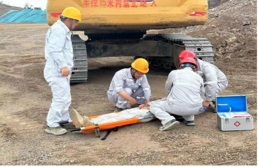 本次演練主要模擬515平臺(tái)發(fā)生車輛傷害事故,一名員工被挖機(jī)回轉(zhuǎn)時(shí)碰傷倒地,頭部撞擊受傷,傷情嚴(yán)重,進(jìn)行緊急救援的情景。