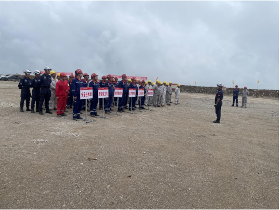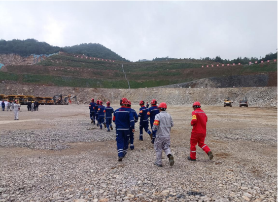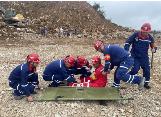演練現(xiàn)場模擬遇強降雨后邊坡發(fā)生垮塌事故,在接到險情報告后,應急指揮部立即啟動應急預案,組織各救援小組趕赴現(xiàn)場